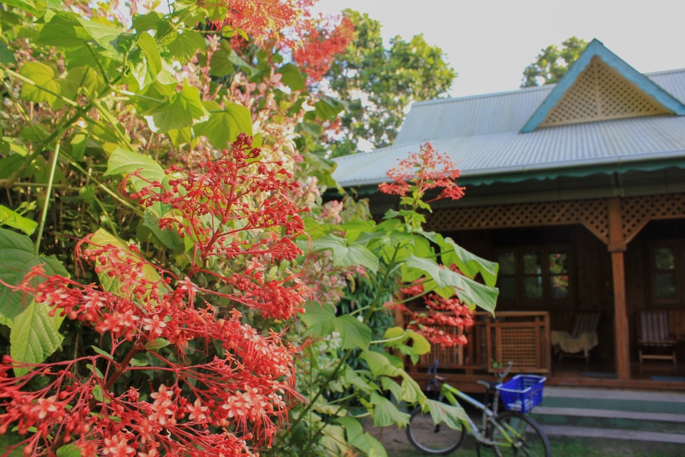 Traditional Creole wooden chalets nestled in a lush tropical garden.